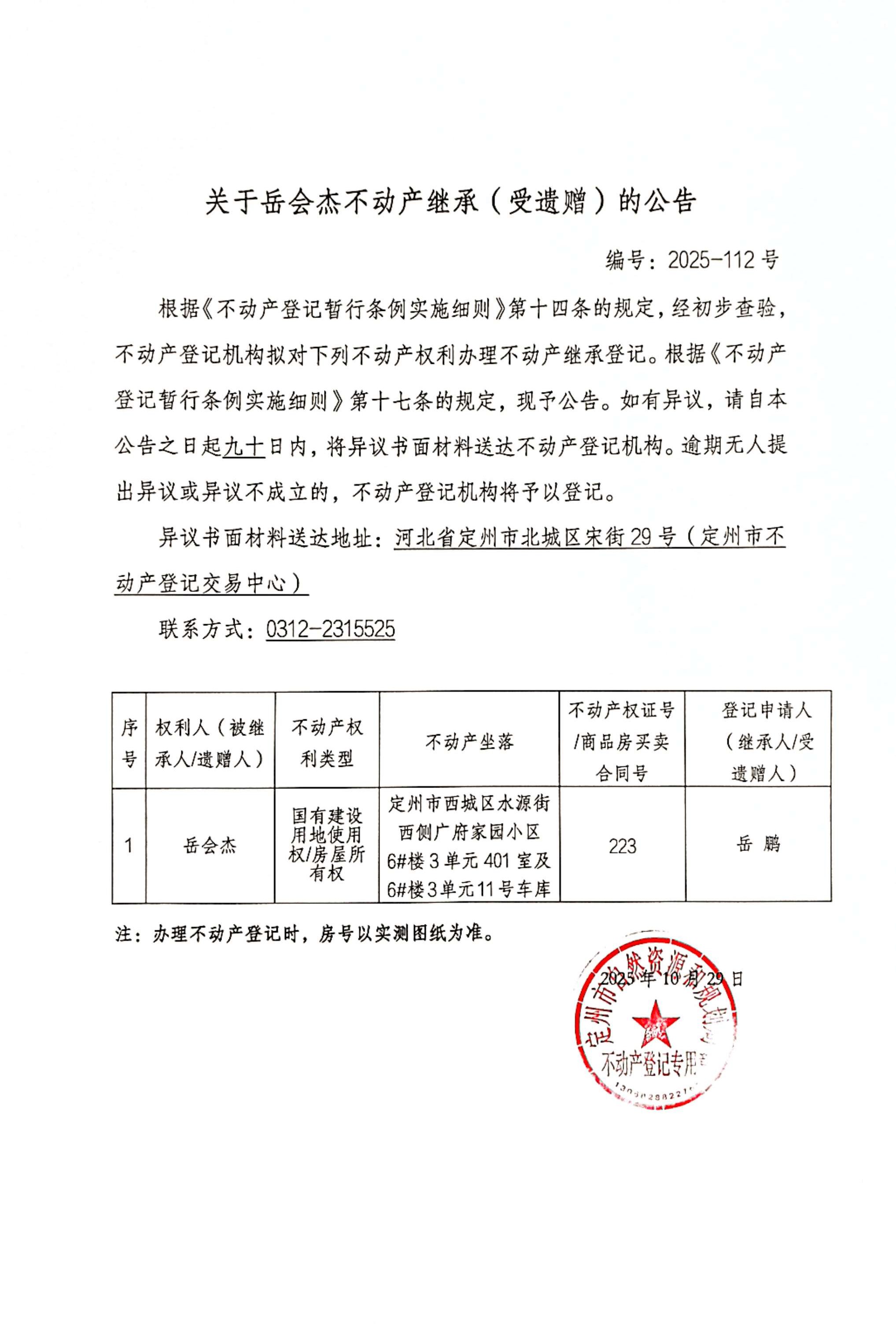 關(guān)于岳會杰不動產(chǎn)繼承(受遺贈)的公告