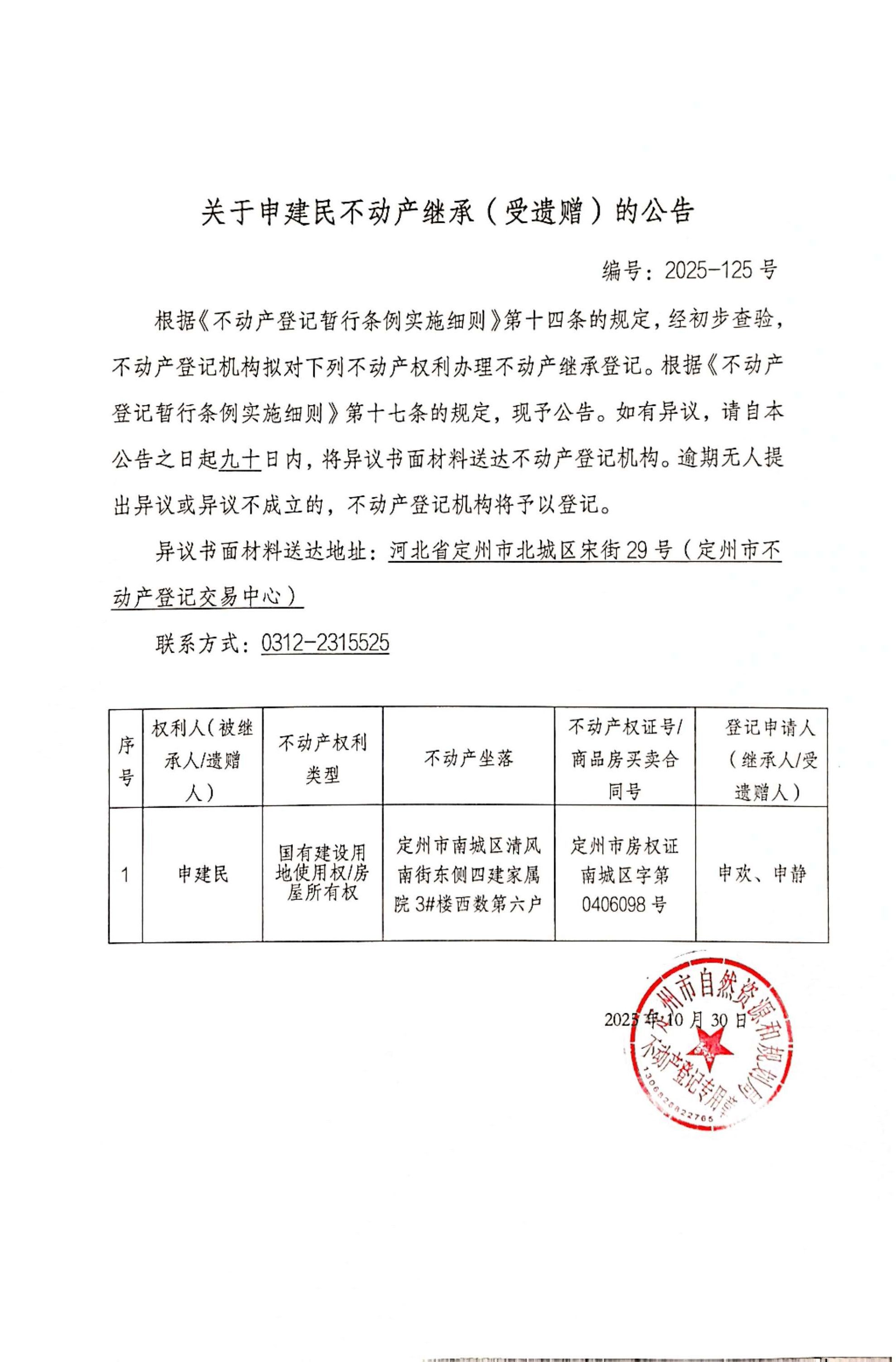 關(guān)于申建民不動產(chǎn)繼承(受遺贈)的公告