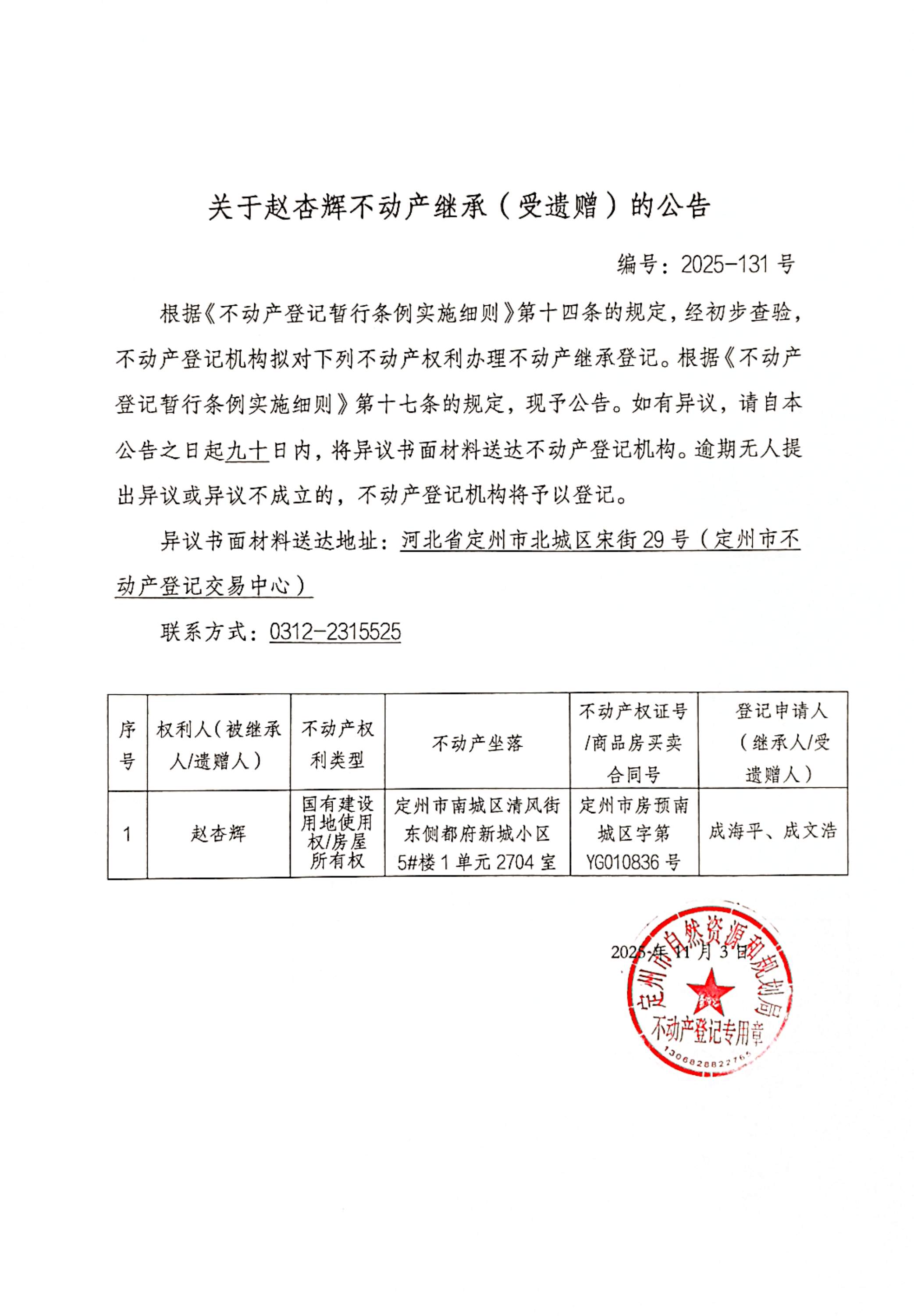 關(guān)于趙杏輝不動(dòng)產(chǎn)繼承(受遺贈(zèng))的公告