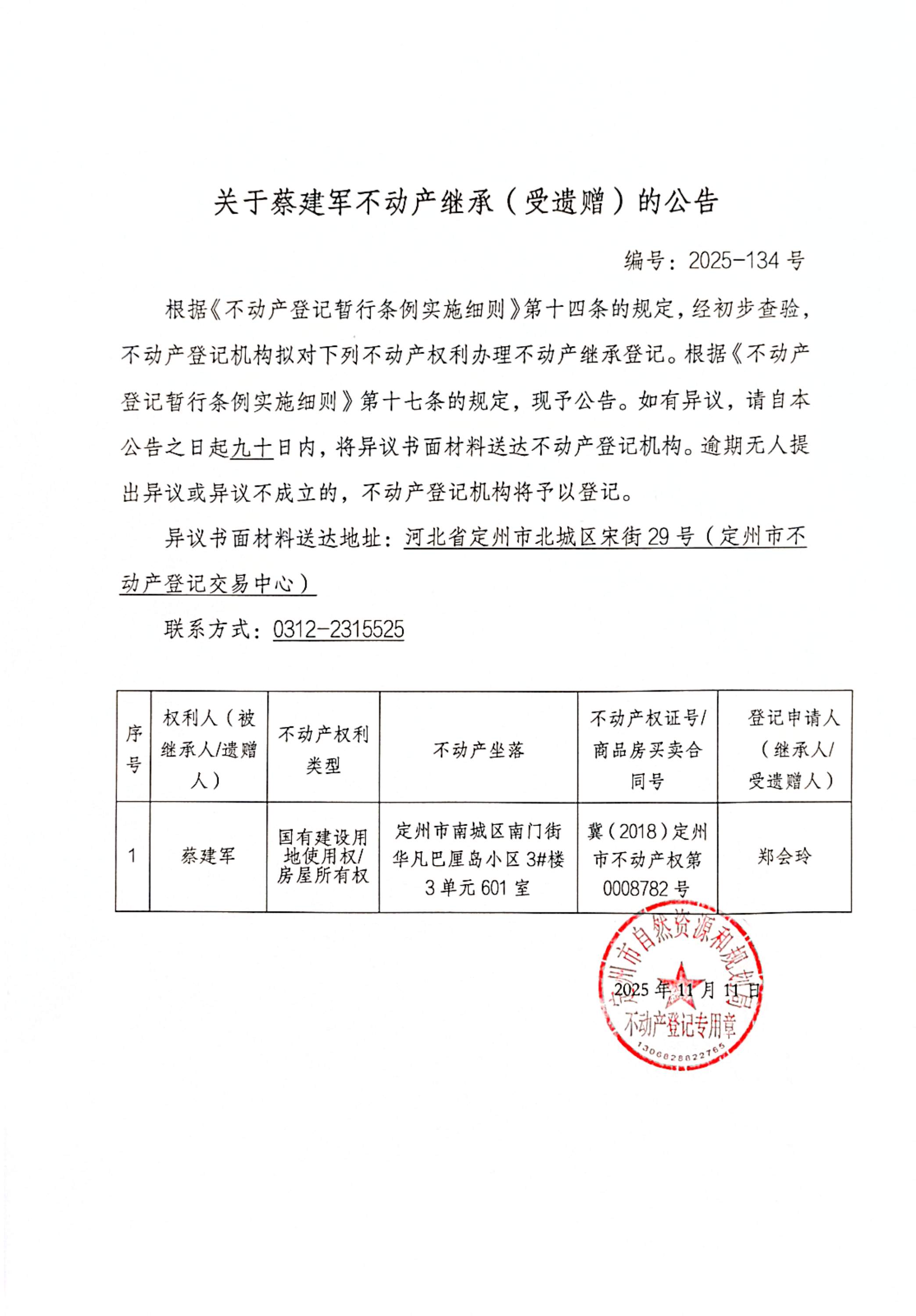 關(guān)于蔡建軍不動(dòng)產(chǎn)繼承(受遺贈(zèng))的公告