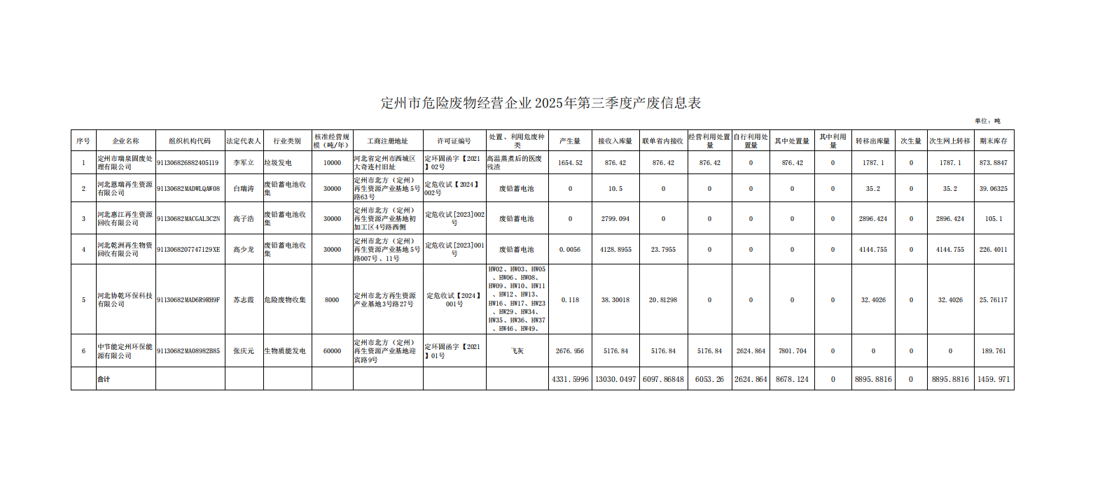 定州市危險(xiǎn)廢物經(jīng)營(yíng)企業(yè)2025年第三季度產(chǎn)廢信息表