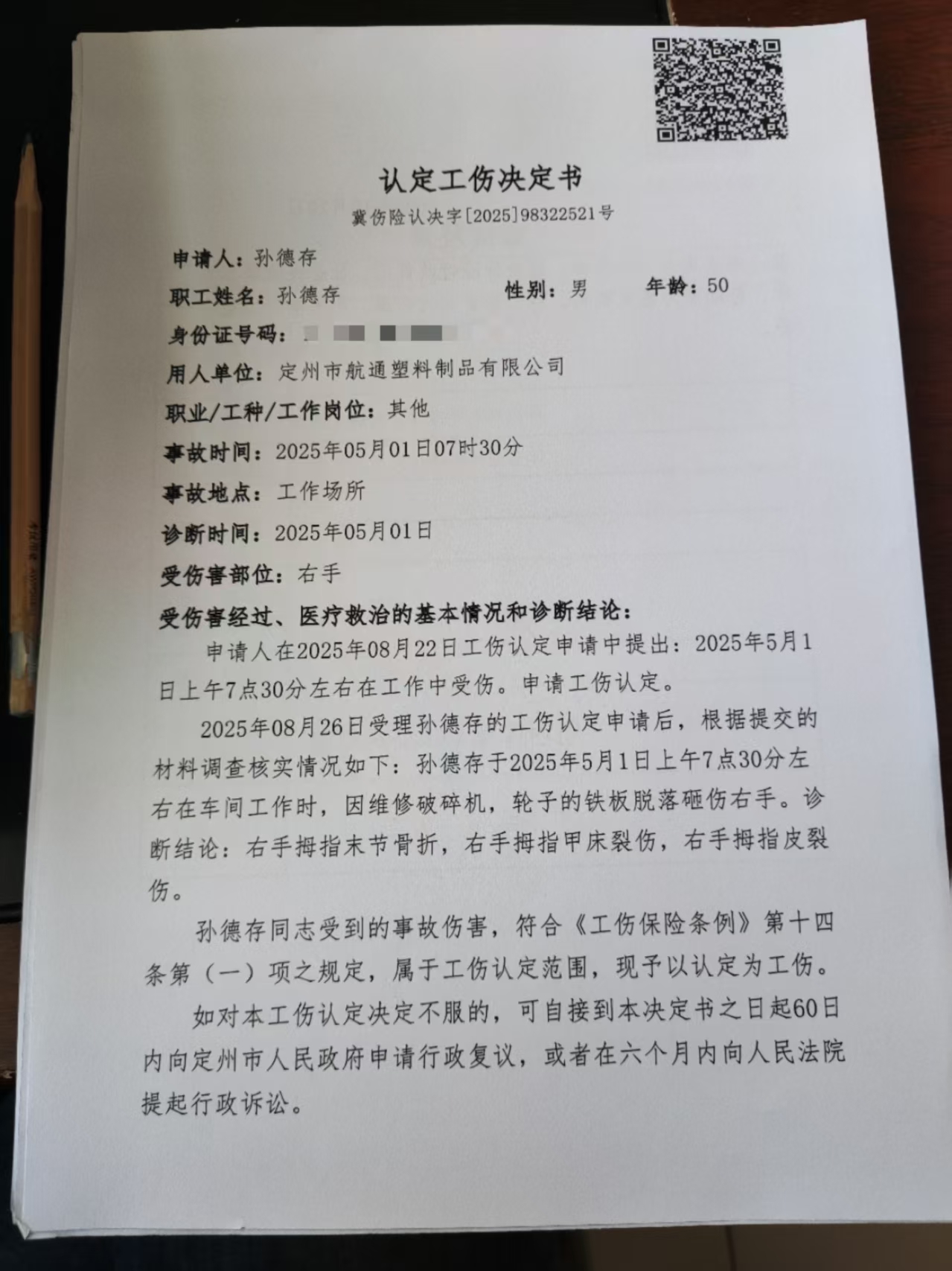 孫德存認(rèn)定工傷決定書