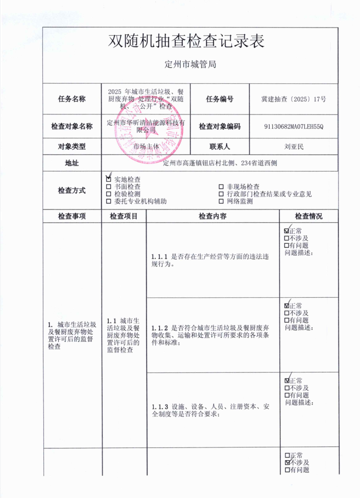 定州市城管局“雙隨機、一公開”林檢查結果(城市生活垃圾及餐廚廢棄物處置許可后的監(jiān)督檢查)