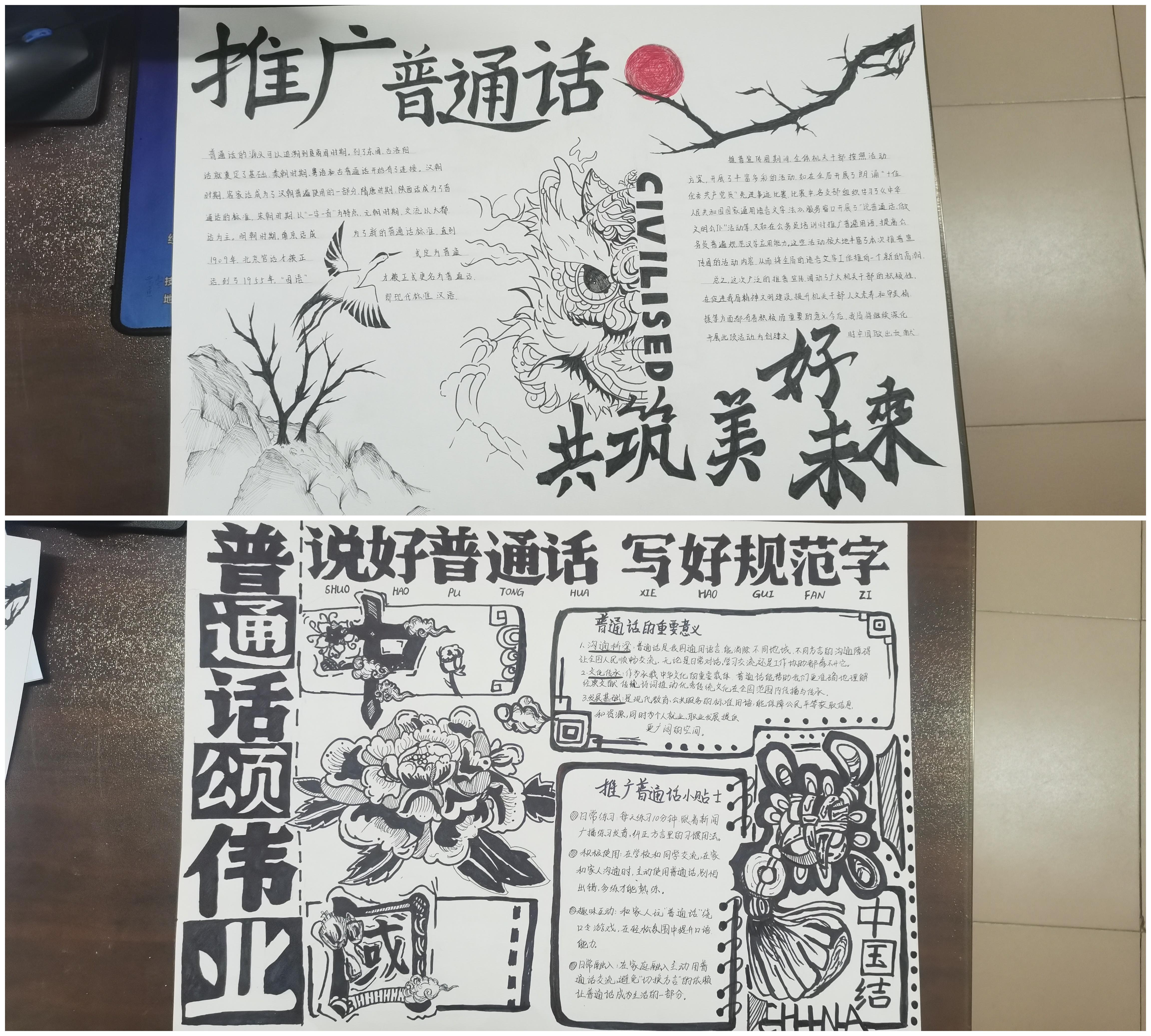 學生以個人或小組形式創(chuàng)作推普手抄報,作品風格各異,有的融入卡通元素,有的采用書法字體,生動展現(xiàn)推普意義。